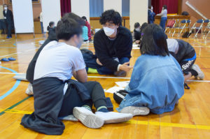事前の宿題として、こどもたちには、自分のいいところを考えて来てもらいました。さらに、班のメンバーにも自分のいいところを聞きながら、みんなにどんな「自分」を伝えるのかを決めて、一行の言葉にしていきました。
